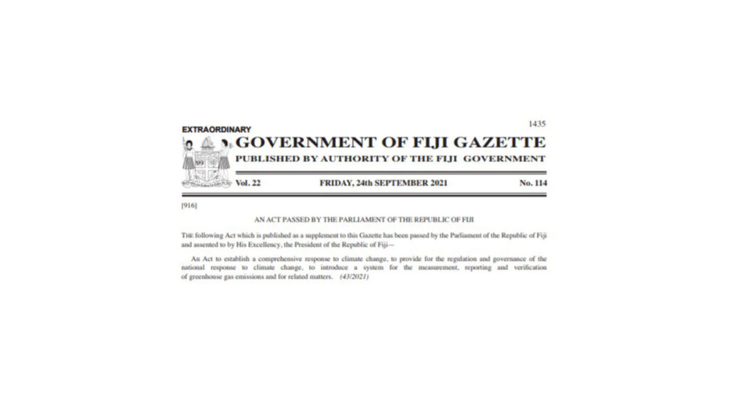 Citation: Fiji. (2021). Climate Change Act 2021: An Act to establish a comprehensive response to climate change, to provide for the regulation and governance of the national response to climate change, to introduce a system for the measurement, reporting and verification of greenhouse gas emissions and for related matters; Act No. 43 of 2021. Suva, Fiji: Government of Fiji. 407 – 492 [87] p.