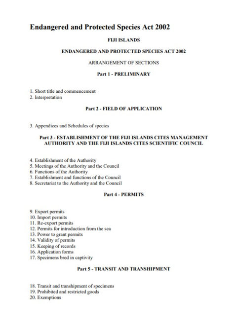 Citation: Fiji. (2002). Endangered and Protected Species Act 2002: An act to regulate and control the international trade, domestic trade, possession and transportation of species protected under the Convention on International Trade on Endangered Species Wild Fauna and Flora (CITES) and for related matters; No 29 of 2002. Suva, Fiji: Government of Fiji. [24] p.