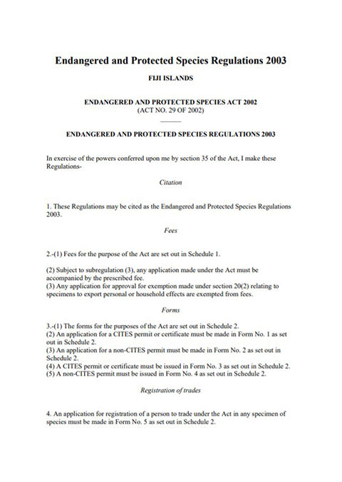 Citation: Fiji. (2003). Endangered and Protected Species Regulations 2003. Suva, Fiji: Government of Fiji. [5] p.