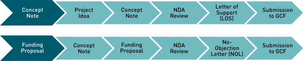 The project developer submits concept notes to the NDA for approval. The NDA determines if the project is aligned with the country work program. As part of the NDA review, the concept note is sent to stakeholders from the public and private sector. Once the NDA is satisfied with the concept note, it issues a No-Objection Letter (NOL) for the project.