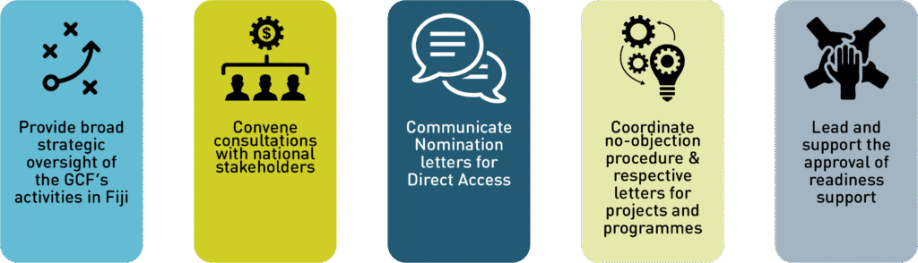 The NDA oversees GCF activities and ensures the alignment with strategic national objectives and priorities. The NDA mobilises country-ownership as a GCF principle and drives ambitious action on adaptation and mitigation through access to GCF resources. The five (5) key responsibilities of the NDA are.